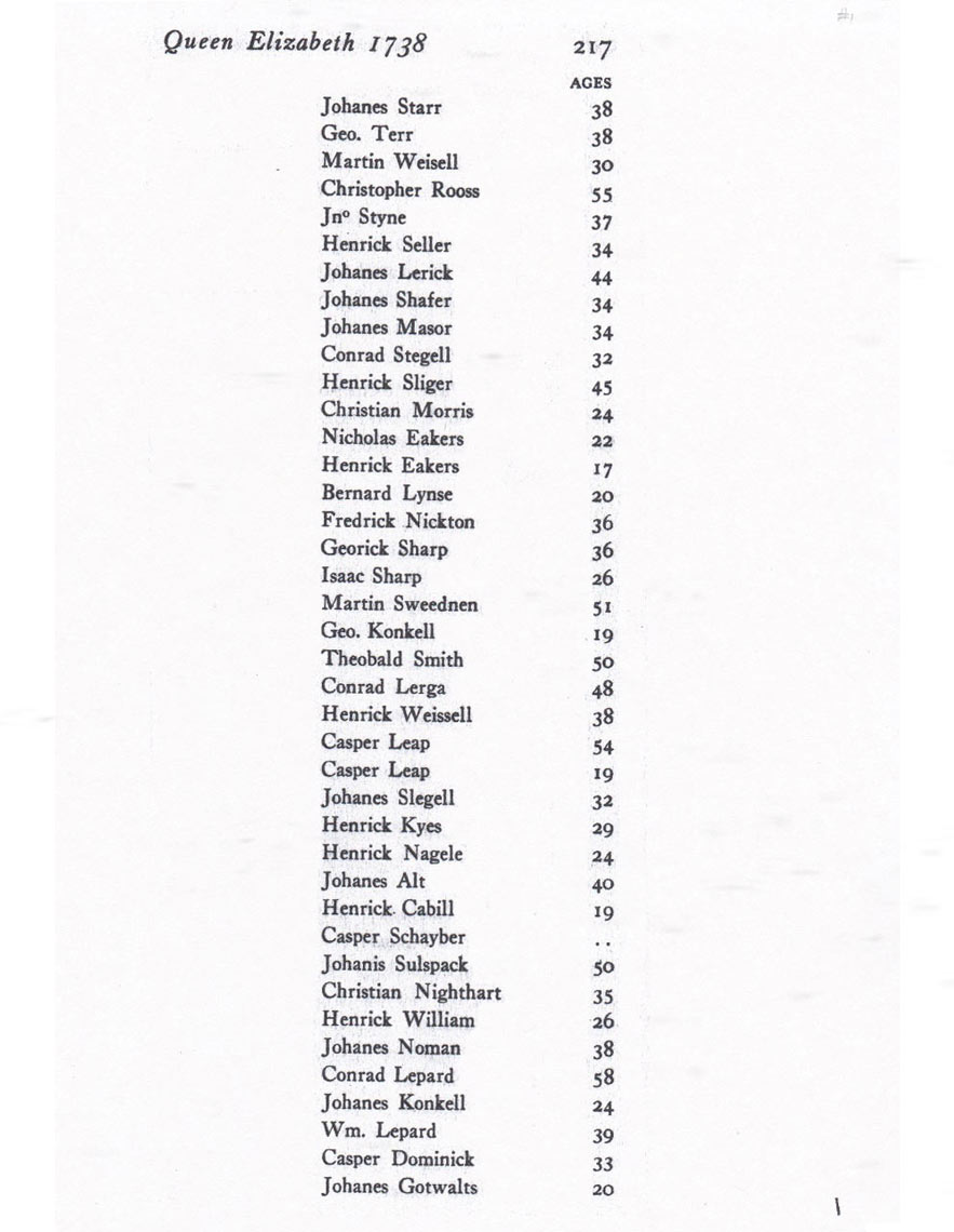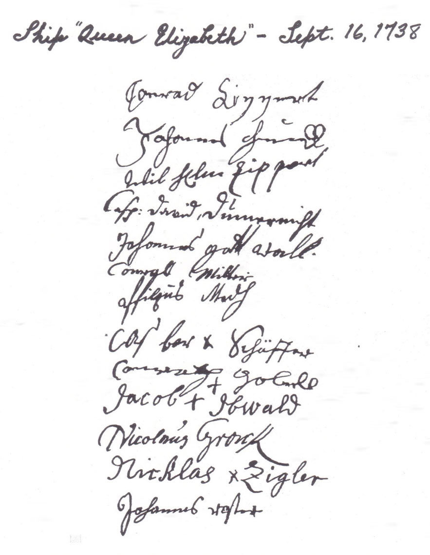 Two additional lists accompany the ship's log. One indicates that each Queen Elizabeth passenger gives up allegiance to his former ruler. The second requires that each passenger swear allegiance to the King of England because the American colonies, pre-Revolutionary War, still belonged to England. Conrad and Wilhelm signed both as required. From the second of these lists, we learn the ages of all the boys and men 16 years of age and older; the women and children normally are not listed.